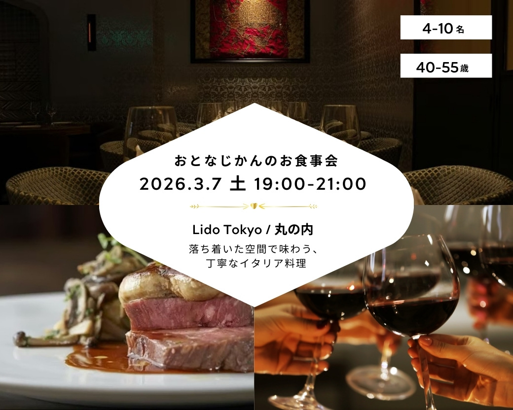 完全着席で交流を愉しむ4〜10名のお食事会です。大人数の場に行きづらい方や、座ってゆったり会話を愉しみたい方におすすめです。