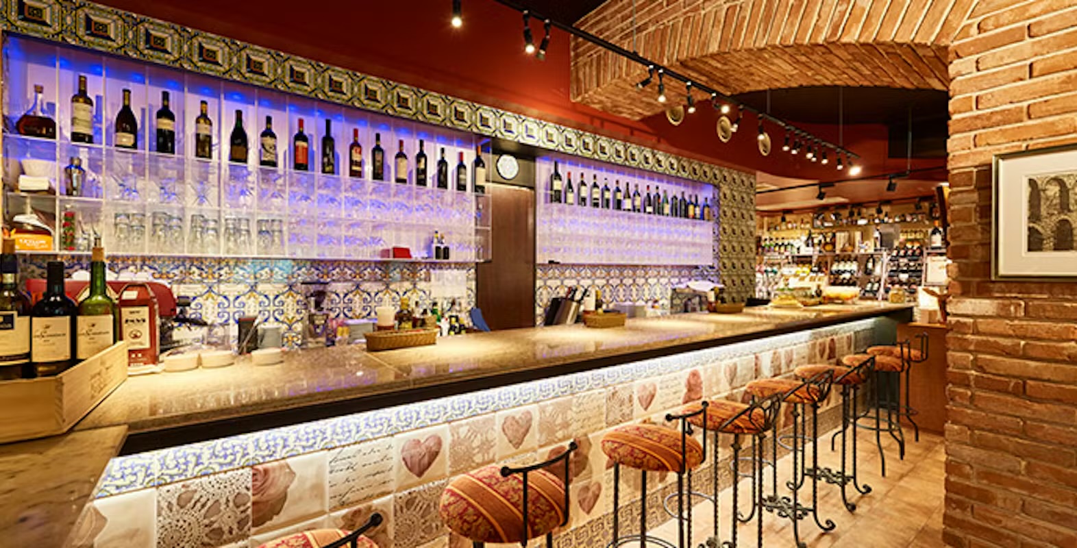 バレンシアタイルや大理石をあしらった店内には、マドリッドの街角を思わせる華やぎと洒脱さが漂います。印象的なカウンターをはじめ、賑わいのなかにも落ち着きが宿り、会話とワインがゆるやかに深まっていく、大人の夜にふさわしい空気感です。銀座らしい洗練も静かに薫ります。