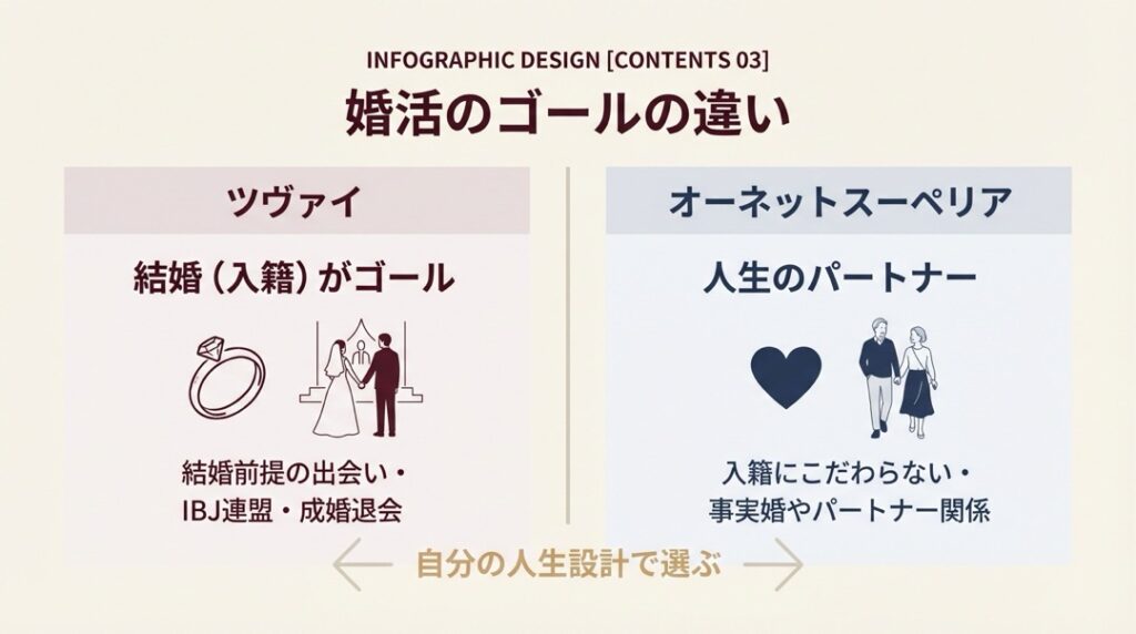 最も大切な判断基準は、あなたが婚活に求める”ゴール”です。ツヴァイは「結婚」を前提としたサービス、オーネットスーペリアは「結婚に限らないパートナーシップ」を前提としたサービスです。この違いが、料金体系からサポート内容まで全てに影響しています。