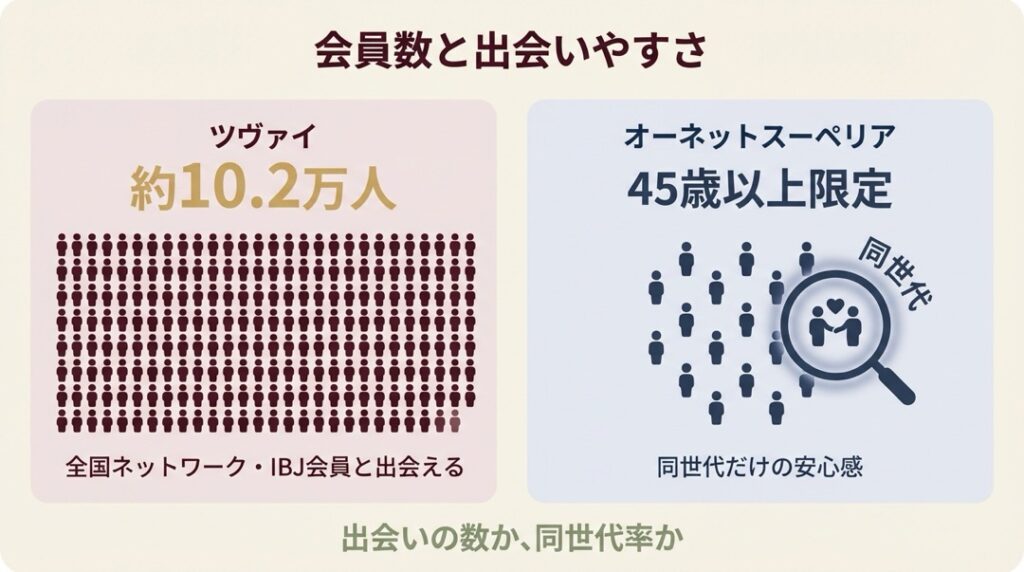 出会いの母数を重視するならツヴァイです。約10.2万人の中から条件に合う方を探せます。一方、同世代の女性と効率的に出会いたいならスーペリアも選択肢になります。スーペリアは女性会員の平均年齢が55歳で、50代女性が最も多い層です。ただし、関東・関西・東海以外にお住まいの場合はツヴァイ一択となります。