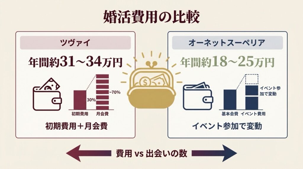 婚活にかかる費用は、入会前に最も気になるポイントではないでしょうか。両社の料金体系はかなり異なりますので、単純な月額比較ではなく1年間の総費用で見ていきましょう。