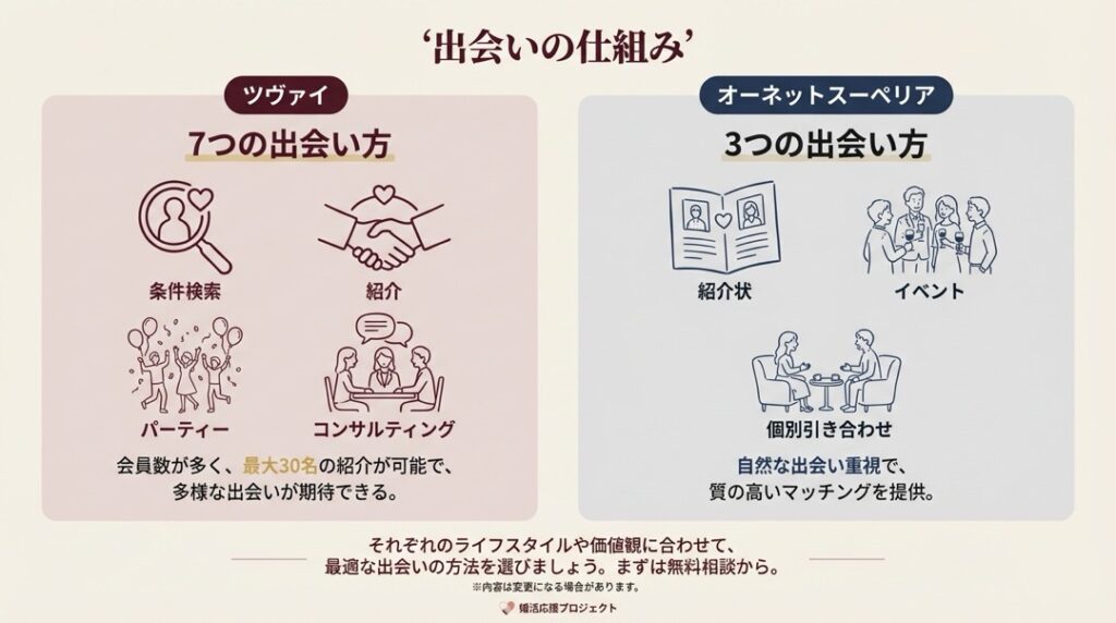 ツヴァイはオンラインでも体験可能、スーペリアは来店が必要です。それぞれ雰囲気やアドバイザーとの相性を確かめた上で判断するのが、後悔しない選び方です。
