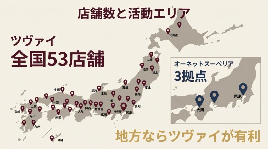 ツヴァイは全国53店舗、オーネットスーペリアは3拠点。この差は非常に大きいです。