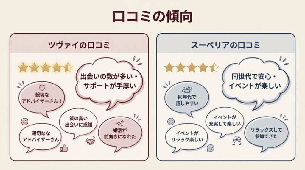 口コミを総合すると、「短期間で結果を出したい」「選択肢は多い方がいい」という方はツヴァイに満足する傾向があり、「焦らず自分のペースで楽しみたい」「同世代の気楽さが欲しい」という方はスーペリアに満足する傾向があります。