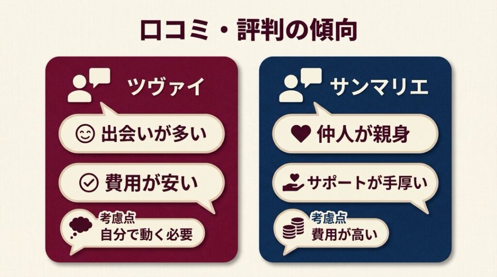 ツヴァイの口コミでは「会員数が多くて出会いのチャンスが豊富」「成婚料0円なので費用が計算しやすい」「価値観マッチングで思いがけない出会いがあった」といったポジティブな声が多く見られます。一方で「カウンセラーの対応に当たり外れがある」「自分から動かないと成果が出にくい」という声もあります。