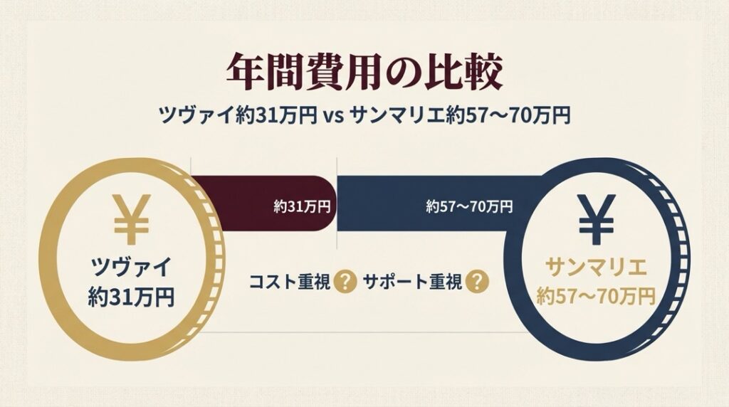 こうして見ると、ツヴァイの年間約31万円に対しサンマリエは約57万〜70万円と、2倍前後の開きがあります。「成婚料がかからない」ツヴァイの料金設計は、特にコスト意識の高い方にとって際立った強みです。