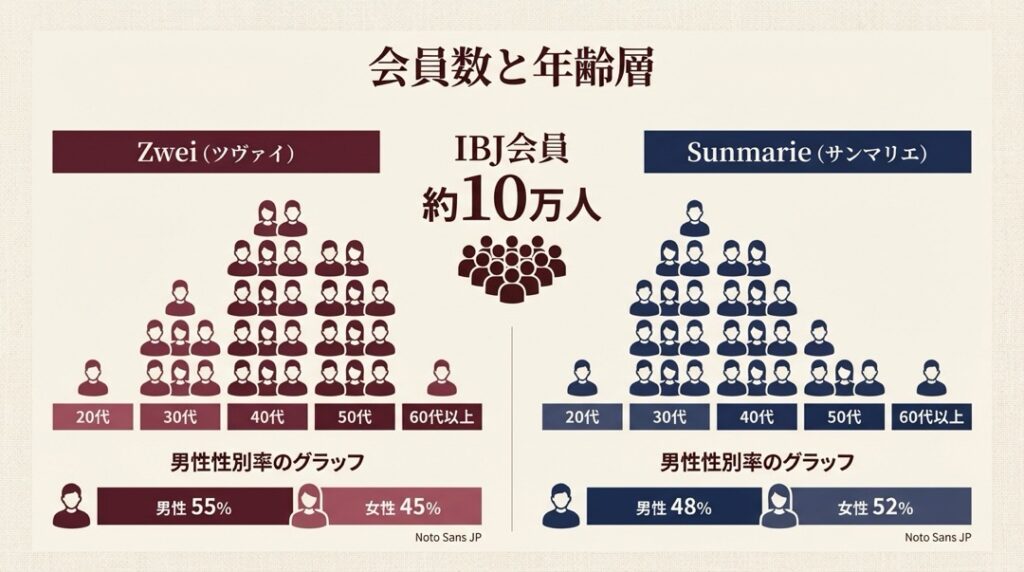 紹介可能な会員数はツヴァイが約10.2万人、サンマリエが約10.1万人で、どちらもIBJ連盟の会員にアクセスできるためほぼ同規模です。つまり、出会える母数という点では大きな差はありません。