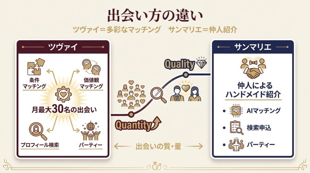 ツヴァイとサンマリエでは、お相手と出会う仕組みが大きく異なります。