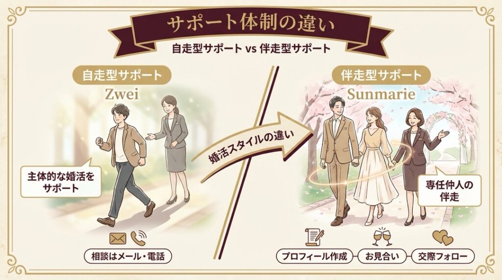 A. 同じIBJグループですが、ツヴァイはデータマッチングを軸にしたハイブリッド型、サンマリエは専任プロ仲人による仲介型です。どちらもIBJ会員約10万人にアクセスできますが、サポートの密度と料金体系が大きく異なります。