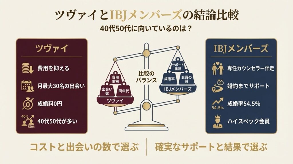 【結論】ツヴァイとIBJメンバーズ、40代50代にはどちらがおすすめ?