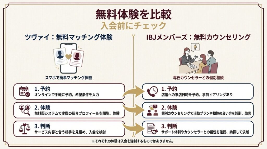 まずはツヴァイの無料マッチング体験で実際の候補者数を確認し、同時にIBJメンバーズの無料カウンセリングでサポートの質を体感して、ご自身の目で比較してみてください。