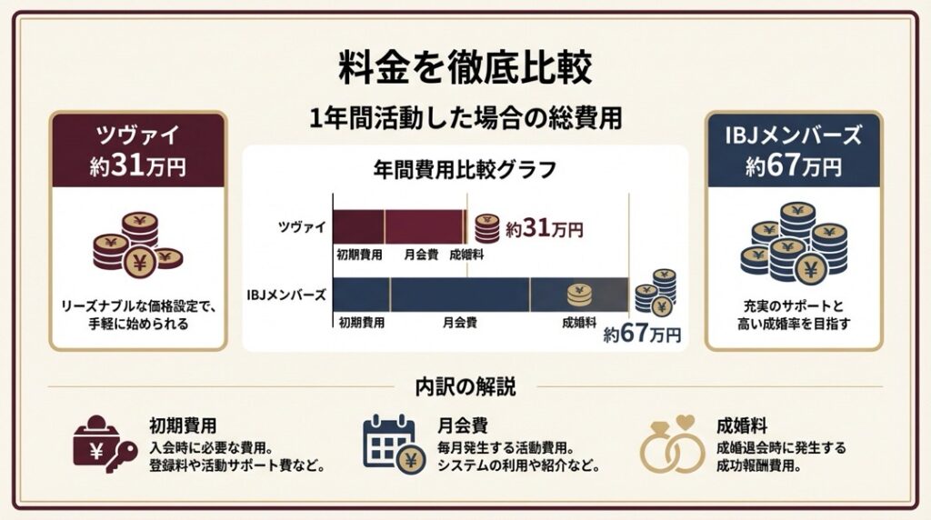 もっとも目を引くのは年間費用の差です。ツヴァイ約31万円に対し、IBJメンバーズは約67万円と倍以上の開きがあります。この差額がサポートの質や成婚定義の違いとしてどう表れるのか、以下で詳しく見ていきます。
