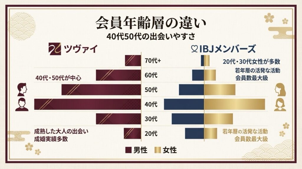 両社ともIBJ連盟の会員にアクセスできるため、紹介可能会員数はツヴァイ約10.2万人、IBJメンバーズ約10.7万人とほぼ同規模です。しかし、自社会員の年齢構成には大きな違いがあります。