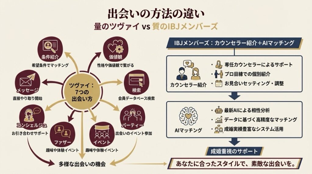 A. ツヴァイは自社独自のマッチングシステム(7種)を軸にしたハイブリッド型で、IBJメンバーズはIBJ連盟のシステムを直営で運用する仲人寄りのハイブリッド型です。出会える会員母数は近いですが、料金体系・サポートの深さ・成婚定義が大きく異なります。