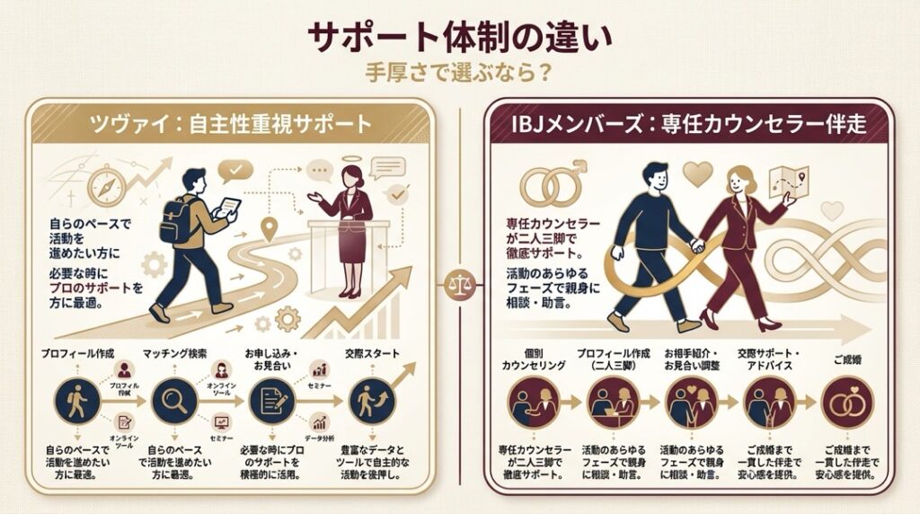 結論を先にお伝えすると、成婚料0円でコストを抑えながら自分のペースで多くの出会いを求めたい方はツヴァイ、費用はかかっても専任カウンセラーの伴走で「婚約」というゴールまで最短で到達したい方はIBJメンバーズが向いています。