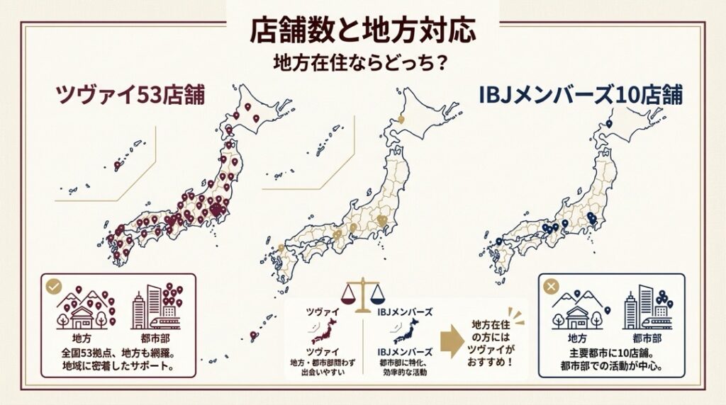 地方在住の40代・50代にとっては、店舗数だけで見てもツヴァイの方が現実的な選択肢と言えるでしょう。