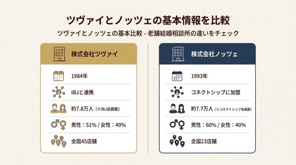 ツヴァイ(1984年創業)とノッツェ(1993年創業)は、どちらも30年以上の歴史を持つ老舗結婚相談所です。「老舗だから安心」と思いがちですが、料金体系・会員数・加盟連盟・サポート体制は大きく異なります。