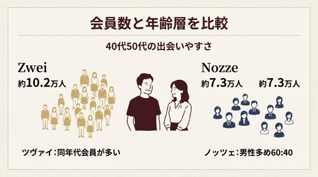 会員数の規模ではツヴァイが約1.4倍のアドバンテージがあります。加えてツヴァイは40代後半〜50代の具体的な会員数を公開しているため、「自分と同年代のお相手がどれだけいるか」を入会前に把握できる安心感があります。