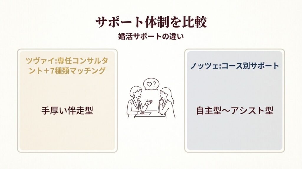 総合的なサポートの手厚さではツヴァイが上回ります。7種類のマッチング方法・月最大30名の紹介・回数無制限の相談がすべて基本料金に含まれるためです。ノッツェはベーシックコースのコストの安さとDNAマッチングの独自性が魅力ですが、手厚いサポートを受けるにはアシストコースを選ぶ必要があり、その場合は費用がツヴァイを上回ります。