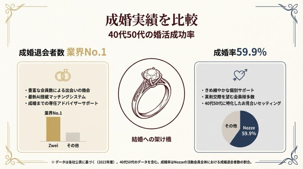 両社の成婚データは算出方法が異なるため単純比較はできません。ノッツェの59.9%は「成婚の定義」や「算出母数」が明示されていないため、数字の大きさだけで判断するのは注意が必要です。一方、ツヴァイの「業界No.1成婚退会者数」はIBJ連盟内での比較で客観的な裏付けがあります。