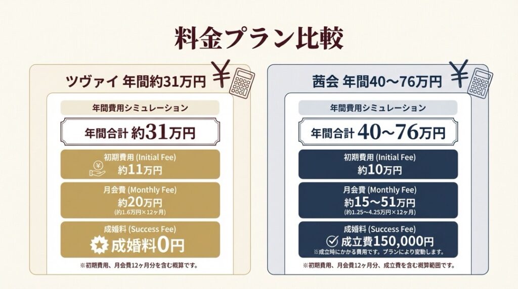 ツヴァイの年間総額は約31万円で、茜会のどのプランよりもリーズナブルです。茜会で最も安いトライアルプランでも約40.7万円と、ツヴァイより約10万円高くなります。これは茜会に成立費(成婚料)150,000円がかかるためです。