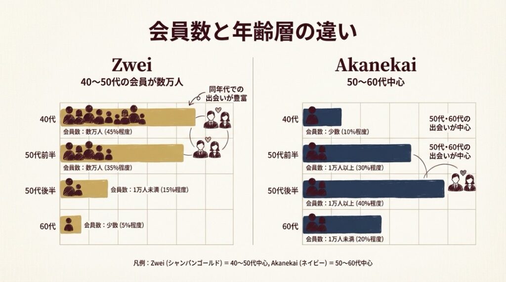 40代の方: ツヴァイが圧倒的に有利です。40代は両社ともに会員がいますが、ツヴァイは40代だけで数万人規模の会員がいるのに対し、茜会は全体で約4,000人のため選択肢が限られます。