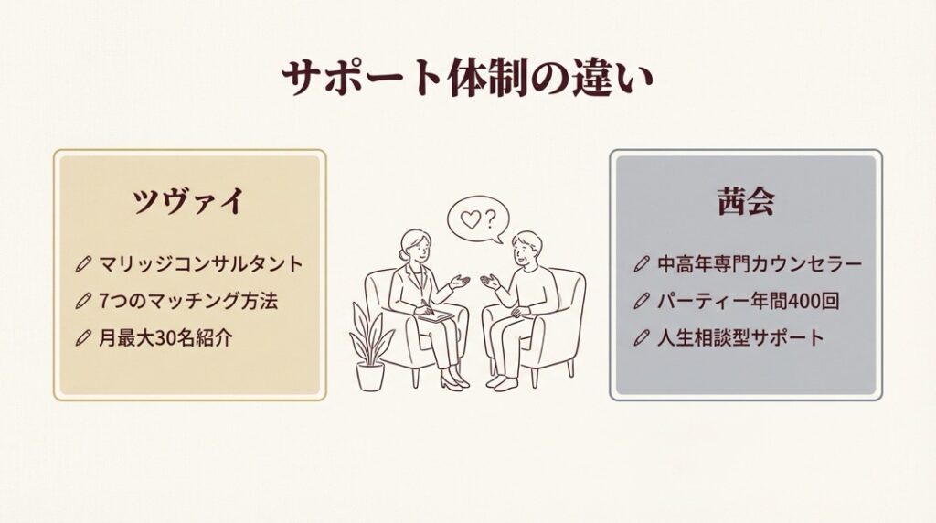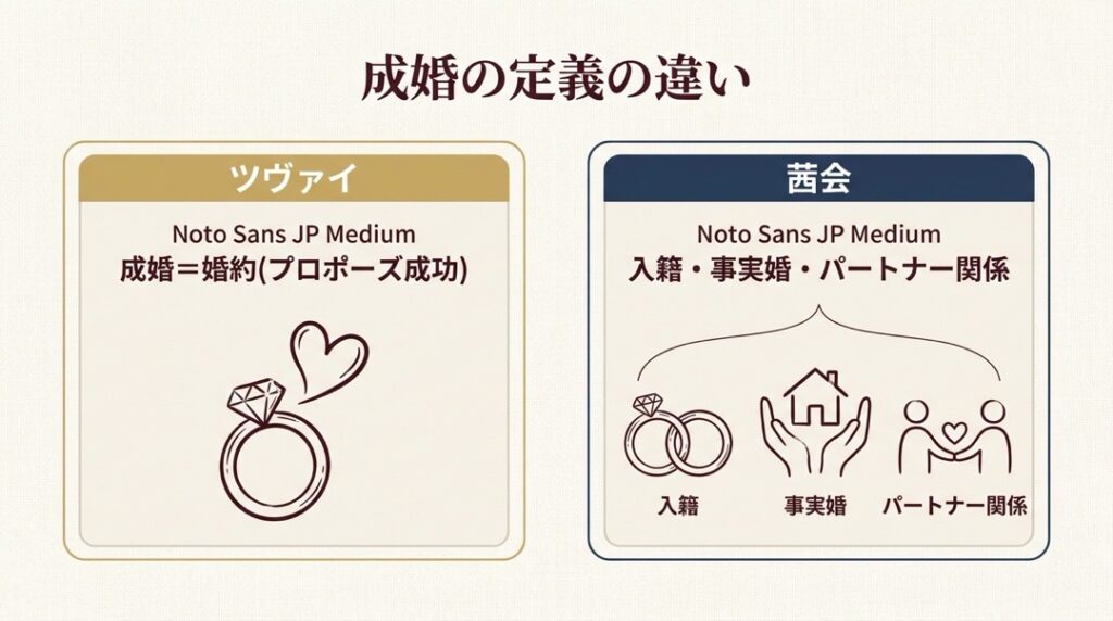両社の最も大きな違いは「ターゲット年齢層」と「成婚の定義」です。ツヴァイは20代後半〜50代まで幅広い年齢層をカバーし、成婚=婚約(プロポーズ成功)と定義しています。茜会は40代以上の中高年・シニアに特化しており、入籍だけでなく事実婚やパートナーシップも「成婚」として認めています。