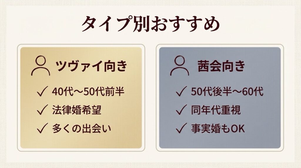 40代〜50代前半で「効率よく多くの人と出会いたい」ならツヴァイの7種類のマッチングが有利です。50代後半〜60代で「中高年の婚活事情を熟知したカウンセラーにじっくり相談したい」なら茜会のアシストプラン以上が適しています。