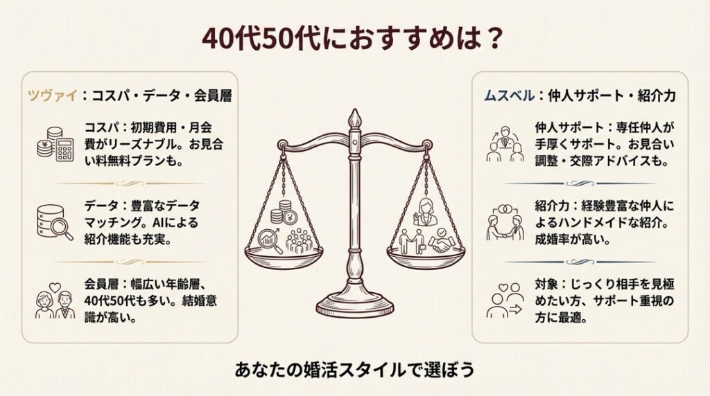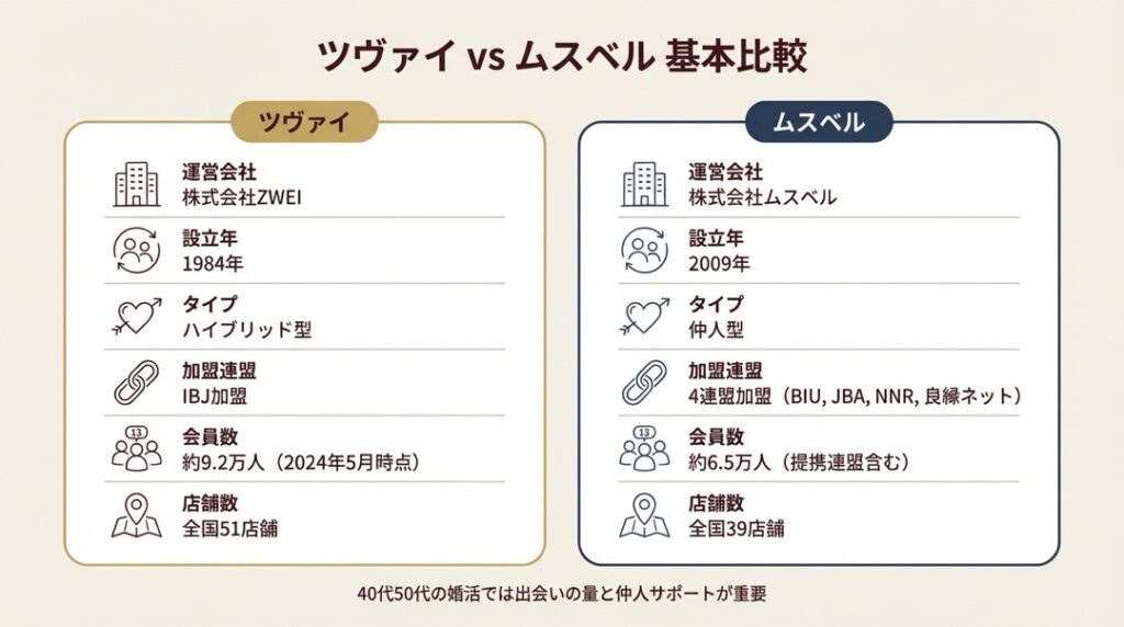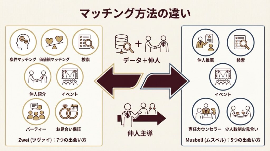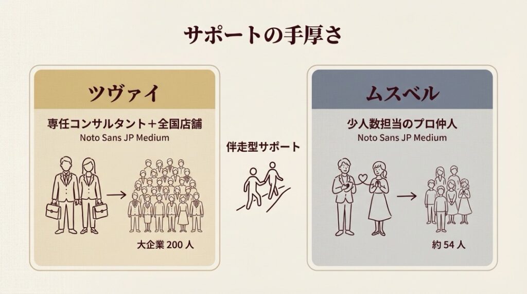 ツヴァイとムスベルは「出会いの仕組み」と「サポートの深さ」で明確に性格が異なる結婚相談所です。