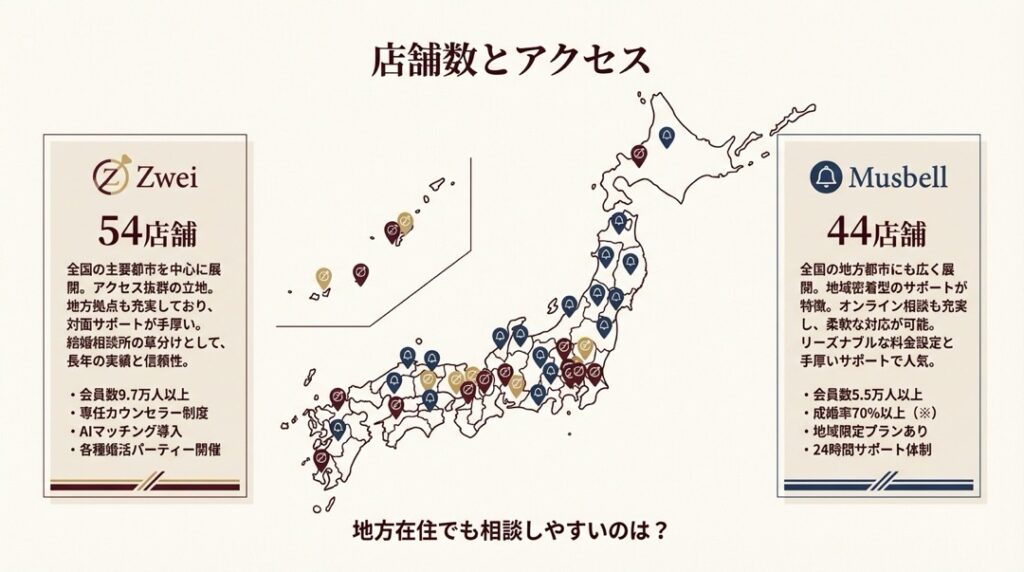 ツヴァイは54店舗、ムスベルは44店舗と、どちらも全国展開していますが、ツヴァイの方が10店舗多く、特に四国(高松・松山)や沖縄(那覇)など、ムスベルがカバーしていない地域にも拠点があります。地方在住の40代・50代にとって、対面相談ができる最寄り店舗の有無は重要な判断材料です。