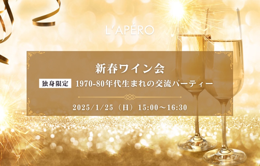 おいしいワインやお食事とともに、同世代の参加者同士で交流と出会いを楽しむワインパーティーです。ワインエキスパートが7種類前後のワインを厳選してご用意します。