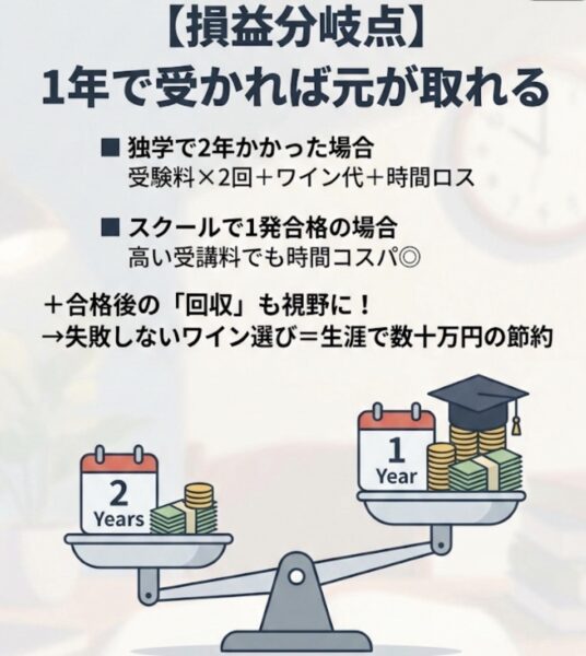 「2年かけて独学で受かる」よりも、「スクールにお金をかけて1年で一発合格する」方が、時間的なコスパは高いと言えます。