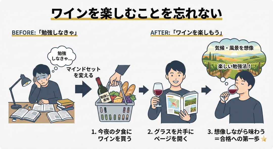 そのワインが作られた土地の気候や風景を想像しながら味わうことが、合格への最初の一歩であり、最も楽しい勉強法です。