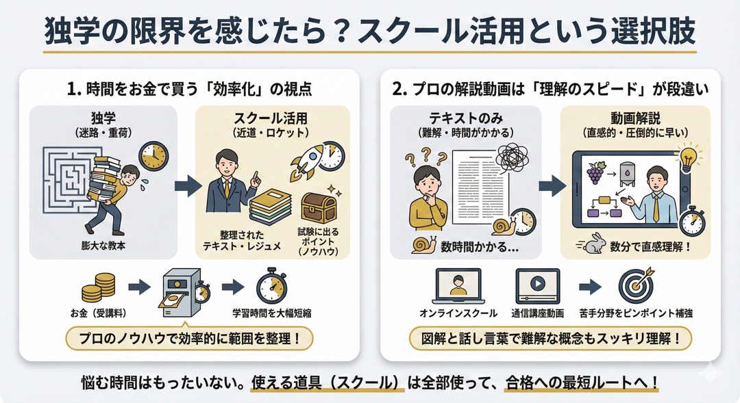 どうしても独学では厳しいと感じたら、無理をする必要はありません。