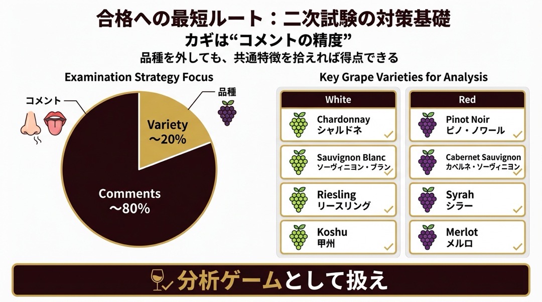 実は、品種を当てることよりも、外観・香り・味わいの「分析コメント」を正解させることが何倍も重要です。