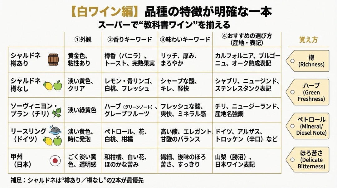 - 樽なし: フランス・シャブリ、または安価なチリ産の「アンウッデッド」表記のもの(レモン、青リンゴ)