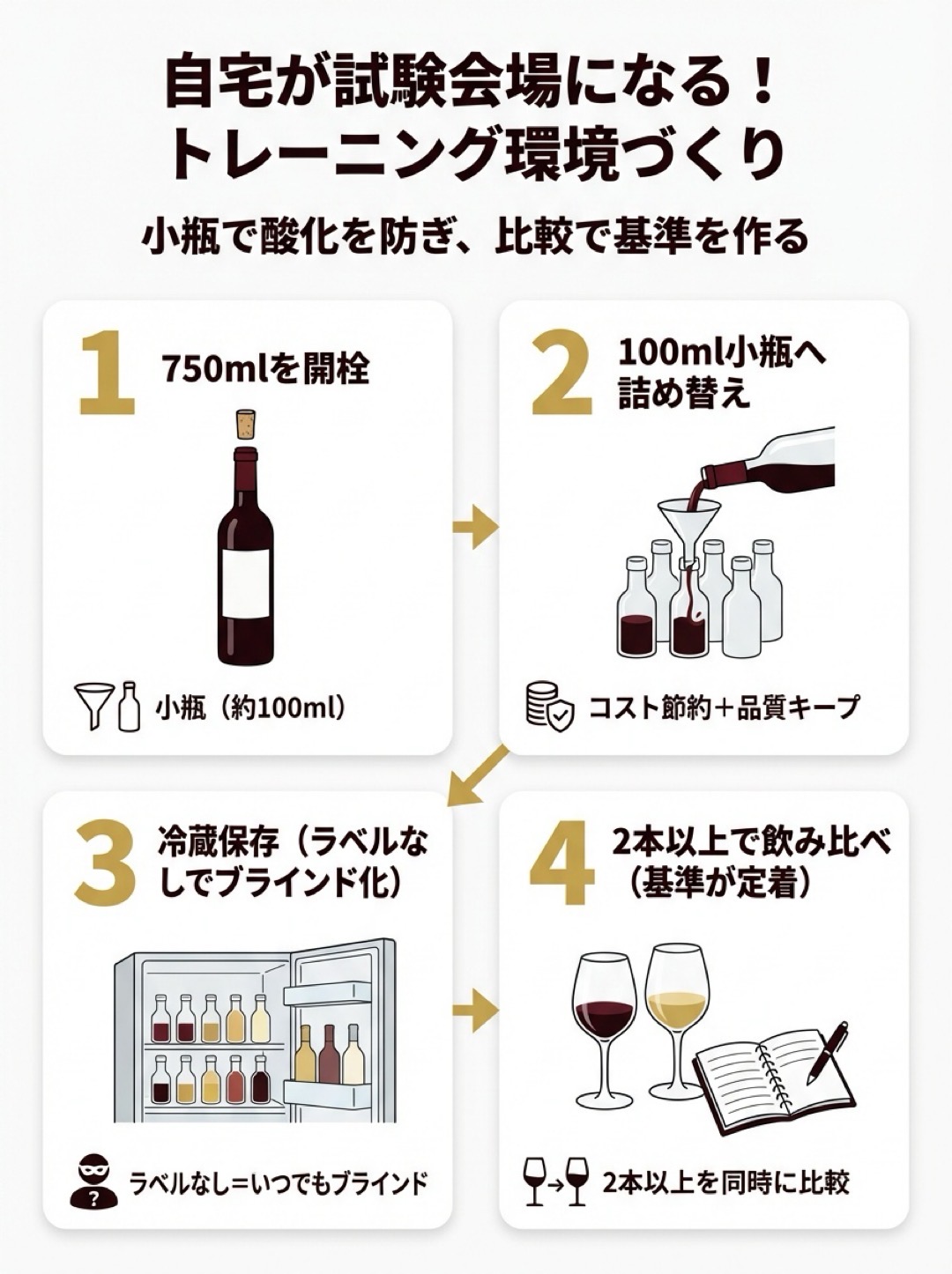 開栓後の酸化を防ぎながら、1本のワインで何度もテイスティング練習ができるため非常に経済的です。