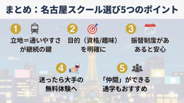 - 栄・伏見・久屋大通: おしゃれな飲食店も多く、授業後の楽しみも充実。